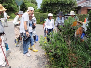 テーマは池のトンボと水生生物とありますが、当然ながら、板山小校門前から目的の池までの観察にも十分時間をとります。道端のヒルザキツキミソウ、生垣の園芸植物の植栽、路傍のウチワサボテン(写真掲載)、水田のヒル(〃)、竹笛でピューピューごっこ、水路でぽんつく、そして、ようやく池です。ただし、池は危ないので、指導員が胴長をはいて、生きものをゲットしました。