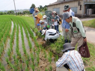 【左】始めのあいさつ     【右】途中の水田…アマガエルやヒルがいました