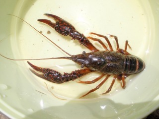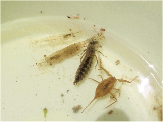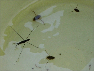 【左】アメリカザリガニ(♂) 【右】アメンボウ、マツモムシ(3びき)…腹を上にして泳ぐ 【左】チチブ、スジエビ