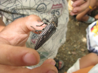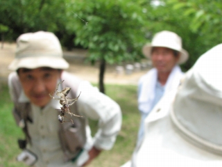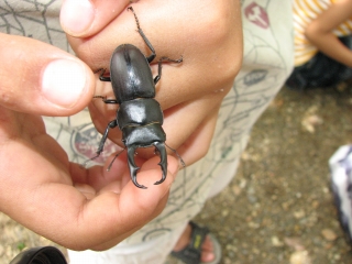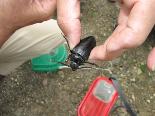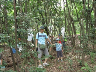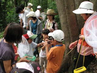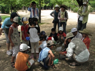 半田市環境センター主催、募集であったため参加者は30名以上となりました。参加者が多いのは嬉しいのですが、正直言って、この公園で、子どもたちが期待している昆虫がどれだけ発見できるか大変心配でした。実際、二昨日前に仕掛けた腐肉のトラップも効果ゼロに等しく、後半は“葉っぱ工作”中心だなと考えていました。しかし、結論から言えば子どもたちにとっても、ほぼ、成功で終わりました。いつも思うことですが、子どもたちの中には、めざとく見つけ、素早く捕まえる子がいて…、助かったわけです。もちろん、葉っぱ工作も好きな子がいて、観察の途中で幾つか作りました。