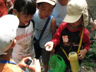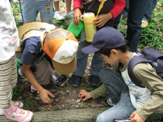 【右】終わりに、ゲットした生きものを出し合って、詳しい説明を聞きました。子どもたちの眼はキラキラ