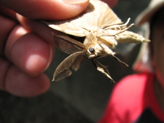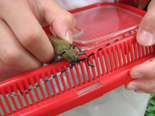 【左】ガ(ヒメエグリバ)の幼虫を手のひらに乗せる 【中】ノコギリカミキリ 【右】クワカミキリ