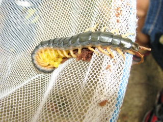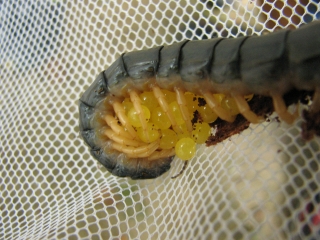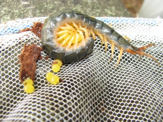 【上3枚】ムカデ(トビズムカデ)が卵を守っている。守っているため突いても逃げない。感動します