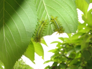 【左】サクラの葉にイラガ(ヒロヘリアオイラガ) 【右】クモがアリを食べている