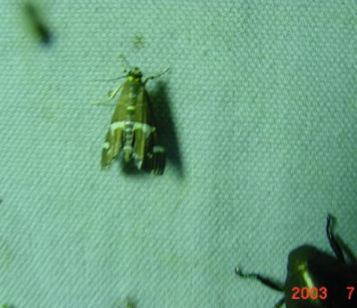 【右】シロオビノメイガ。幼虫はホウレンソウやアカザの仲間が食草です。昼間も活動し、野原などでよく見られます。