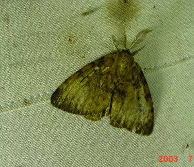 【左】マイマイガ。サクラなどバラ科の木に良く発生します。若齢幼虫は糸を吐いて下垂するのでブランコ毛虫とも呼ばれています。