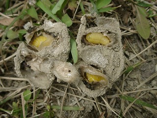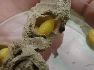 【右】土の中の様子。ハチのさなぎが6匹入っていました。ハチの種類…現在調査中