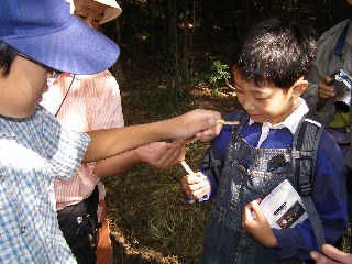 キノコを採集する際の留意事項や時期的にハチに注意することなどを促した後、1時間ほど林の中に入ってキノコ探しをしました。外観の形容がぴったりで、ふっくらしたホコリタケ、薄紫色をした上品でいかにも美味しそうな食用のムラサキシメジやカワラタケ、アカハツ、チョウジチチタケなどを観察・採集しました。集合場所に戻り、皆で採集したキノコの図鑑調べによる振り返りや分ち合いを行いました(山田/記)。