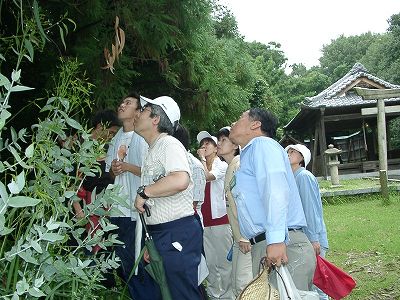 "カモフラージュ"が終わって、「少し時間があるから、神社内を一回りして帰ろう」と言うことに決め、1歩入ったら、大きなユーカリの木の前で、説明が始まり、結果的に、この場から動かないまま、帰路につきました。
