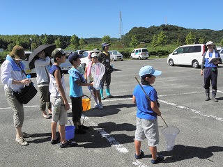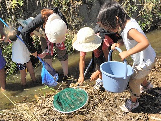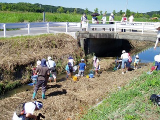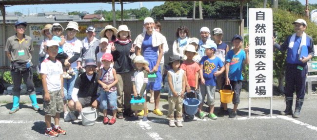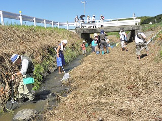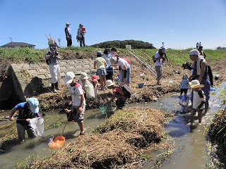 例年残暑の中での観察会ですが、ことしは更に厳しい暑さの中での観察会になりました。河川域内も含めて周辺地域の除草作業が実施された後であり、河川域内の移動がしやすく、魚類の観察には好条件でしたが、昆虫類の観察には若干条件の悪い状態でした。 全体的にみて、確認された生物は昨年並みで、やや少ない感じでした。3年連続で観察されたウナギは今回観察されませんでしたが、今年のトピックとして、汽水域の魚であるスズキが確認されたのは大きな収穫でした。 猛暑のため参加者が少ないのではないかと心配されましたが、昨年同様親子の参加も多く、子どもさんだけでなく、親御さんも積極的に川の中に入り生き物採取に汗を流されておりました。採取した生物の確認の際、似た種類のカエルの見分け方、生き物の名前の由来も交えた観察指導員による解説に熱心に聴き入り、質問も多く出て、今年も有意義な観察会となりました。 また、昨年に引き続き「知多半島ケーブルネットワーク」の取材、COP10(生物多様性条約第10回締約国会議)関連で「NHKプラネット」の取材もありました。生物多様性について考えるには、こうした地域レベルの自然観察会はまたと無い機会と考えられます。こうした取材報道による紹介も通じて、今後とも観察会を充実したものにしていきたいと考えています。(記・斉藤)