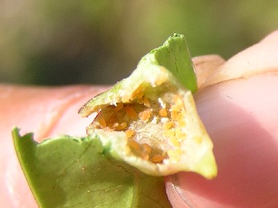 【右】中に、アブラムシが住んでいました。アブラムシがかじったところの細胞が肥大し、瘤になるそうです。