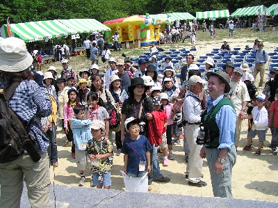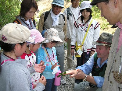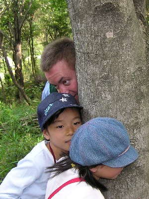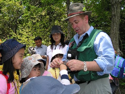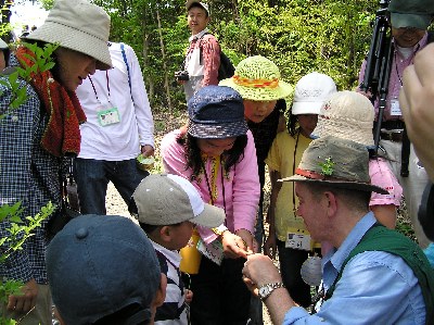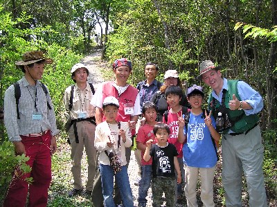 【右】出発前にジョンさんが森の生き物体操を教えてくれました。
