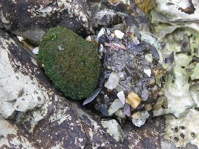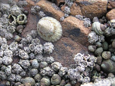 【左】コカモガイ、タマキビ、イワフジツボに付着しています。
