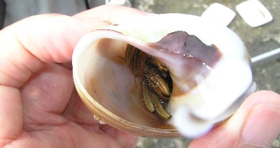 【右】クボガイです。クボガイの殻にシマメノウフネガイ着生していました。