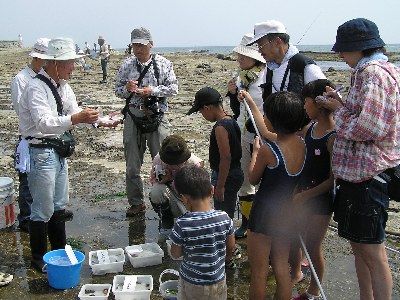 【左】どんな生き物が見られたか、分かち合いをしています。