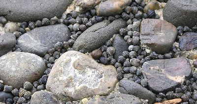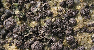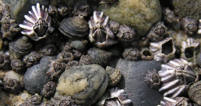 【左】シロスジフジツボ、イワフジツボ、タマキビが同居しているところもありました。