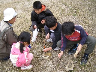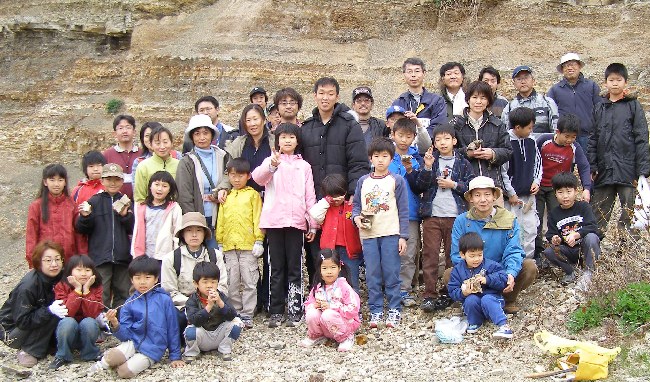 化石採集は、毎年、恒例になっている観察会で子供たちに人気があります。それぞれタガネやハンマーを持参して化石の取り出しに挑戦します。目に見えない宝探しは夢があります。道具を使っての作業は子供たちにとって良い経験になります。最近、映像、音響などの技術革新が進み、居ながらにしてすばらしい体験ができるものが出てきました。しかし、野外での自然とのふれあいは、フィールドで石や道具に触りる事をしなければ体験できません。今回も子供たちは、活き活きと自然体験ができました。