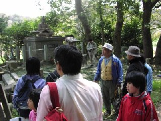 【左】義朝公最期の地、湯殿跡で義朝公、暗殺説と自殺説のお話をしています。
