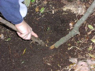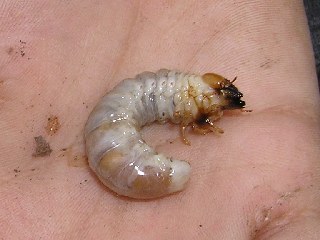 【左】朽木置き場で子供たちが見つけたコクワガタの幼虫。