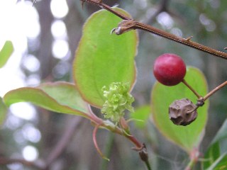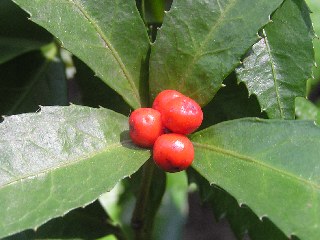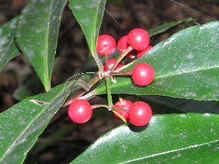 【右】マンリョウ(ヤブコウジ科)。今年は冬鳥が少なかったのでしょうか、実が未だ残っていました。