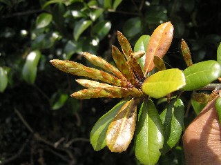 【左】ウバメガシの芽。名前はこの芽の色が姥目に似ているところからといわれています。