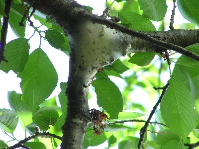 【左】オビカレハの中令幼虫です。糸を出して集まっています。刺しませんから嫌わないでください。