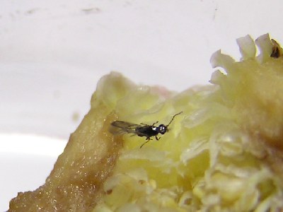 【右】イヌビワコバチです。イヌビワの花嚢(かのう)で生活し、雄株から雌株に花粉を運んでくれます。