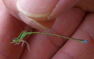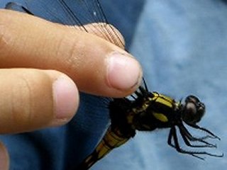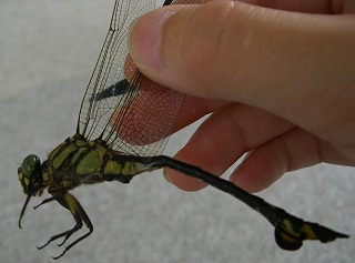まず、増田池周辺をまわり、トンボを探しました。池の縁に生える「アカメヤナギ」には樹液が出始めるとクワガタも寄ってくるなどの話題で、「父」が「少年」に戻り出し、ウチワヤンマが目の前を跳んでいくと、我が子よりも目を輝かせてタモを振るい始めました。数頭のウチワヤンマが池近くの枝でポールポジション争いを始めました。そこを少年に戻った父がタモを振るい、ついに捕まえることとなりました。ウチワヤンマの腹部第8節が黄色く、輝いて見えました。ウチワヤンマと言っても「ヤンマ」の仲間ではなく、「サナエトンボ」の仲間だそうです。