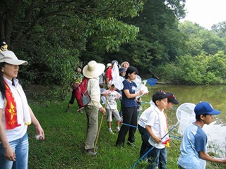 梅雨の明けきらない曇り空の中、蒸し暑いこと限りのない一日でした。遠くにセミの声を聞きつつ、タモと虫かごを手にでに参加者が集まってきました。