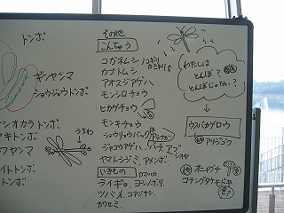 最後の分かち合いの時に始めるときの虫問題をもう一度考えました。正解は「ウスバカゲロウ」で「トンボの仲間ではない」でした。トンボとの大きなちがいは触角でした。トンボの触角は眼の間から出ていて、短くて小さい。ウスバカゲロウの触角はそれに比べて長い、とみんなで考えました。