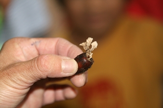 【左】キノコとは 室内での説明  【右】ドングリに生えたキノコ