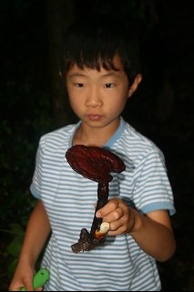 【左】キノコを求めて園内を散策   【右】採集したキノコをもって(マンネンタケ)
