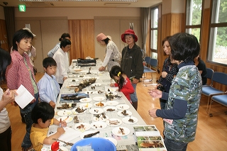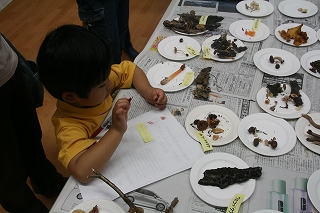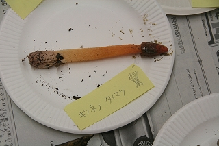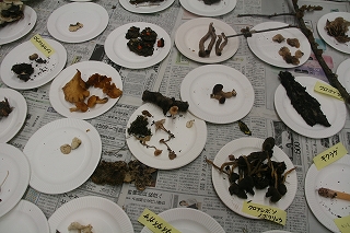 初夏のキノコの観察。朝の小雨の後の曇った天気でした。キノコにとってはうれしい雨だったかも。参加者の皆さんはキノコとの出会いを楽しみに集まった。村瀬指導員からきのこの興味深いお話を聞き、最初にクロアシボソノボリリュウというおもしろいキノコを観察し,その後,二つ池の森のそれぞれの思いの場所に分け入っていった。約一時間後、成果を見せ合ったり,指導員からキノコの同定と食毒の見分け方の難しさや毒性の話を聞いたりした。紙皿には予想以上にいろいろキノコが並び、キツネノタイマツで盛り上がり,マンネンタケなどこんなものも見つけることができたんだと喜びもひとしおだった。終わりには食べられるキノコのキクラゲを分け合って解散した。(記・吉川)
