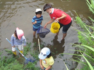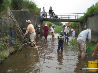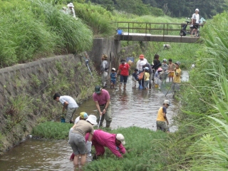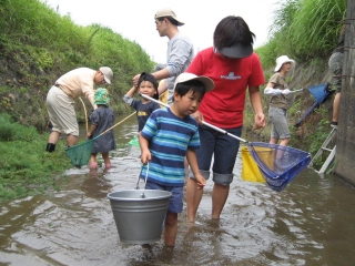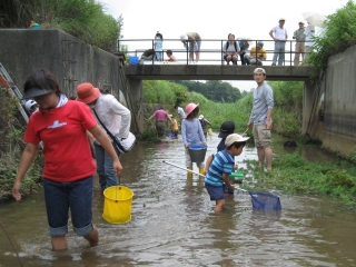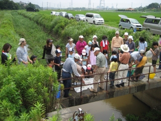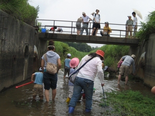 生き物調べに先立って、どんなものが採れるのか一昨日の資料から説明。そして川へ。川幅は4m程、川底は平らで深さは20〜3 0cm。オオフサモの一面に広がる周辺をまさぐり始めた参加者らから「いたいた、魚だ。ザリガニだ」の声があがる。