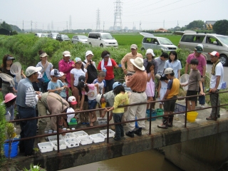 なかには川の真ん中を静かにすくって「採れないネー」の親子さんも。たまたま隣に居合わせた原が、こんな要領でと水草近くにタモを置き、足でぱしやぱしや。タモを上げれば見事なザリガニが一匹。それを見ていた親子さんも早速ぱしやぱしや。「いた−、魚だ−」の声。見れば成魚間近のタナゴ。「やりましたネー」と顔を見合わせにっこり。