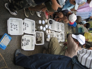 指導員の諸氏は、当然のことながら「プラックバスだ、ウナギだ」と種類を増やしている。そして1時間後。岸辺に並べた器に収穫種を分け、小瓶に入れて説明、回覧。