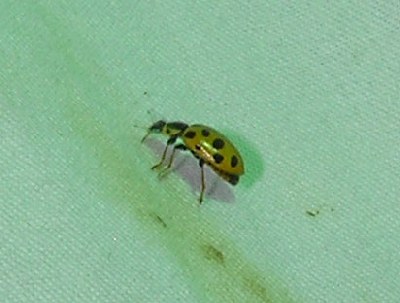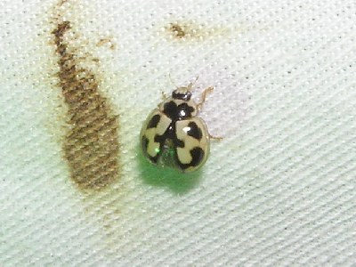 【左】ジュウサンホシテントウ。ヨシの生えたところに見られる比較的少ないテントウムシです。