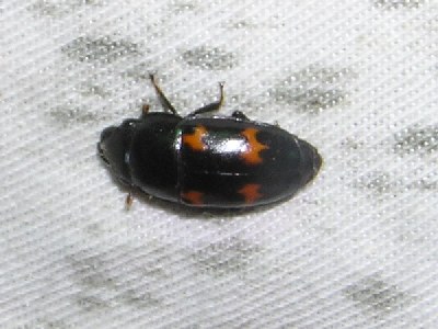 【右】ヨツボシケシキスイはクワガタと同じ場所で見かけます。樹皮に産卵し、幼虫は樹液のほか、他の昆虫の幼虫も食べる。
