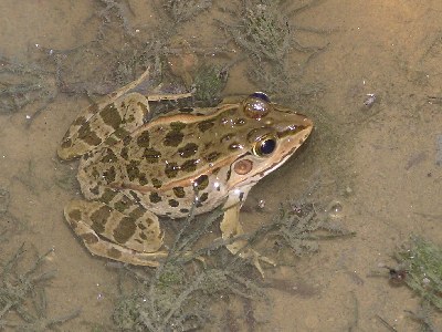 【右】ホタルが見られた水田にいた貴重なダルマガエル。植物は車軸藻植物のシャジモという植物です。