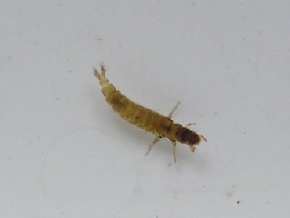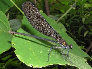 【左】やや汚れたところに住むコガタシマトビケラでしょうか。 【右】御婦人のお歯黒から名前が付いたハグロトンボの♀