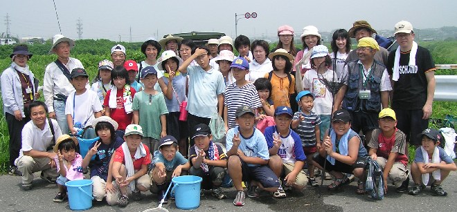 タモの使い方を金内指導員に説明を受けた。しかし、タモとバケツを持ったままの子どもが多い。説明を聞いていた子と聞かなかった子の違いが現れ、聞いていた子どもはよく採れて、歓声が上がる。大きな魚、手の長いエビ、川の中を探る子。草むらを観る子。