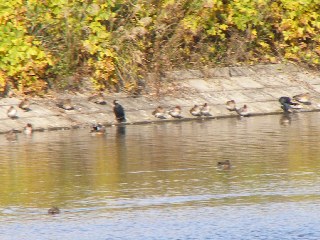 【右】玉越池の堤の土手でカモやカワウが日向ぼっこしていました。