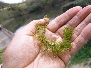 【右】青池に繁茂している外来植物のフサジュンサイ。