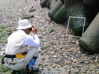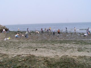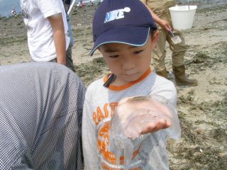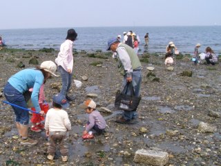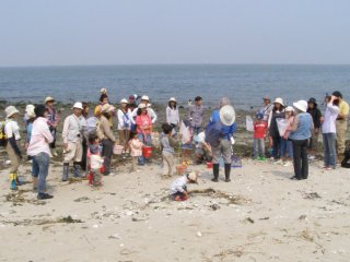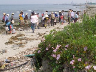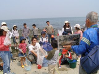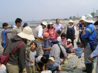 【左】ハマヒルガオが咲いているところから下りました。 【右】漁協でアサリの養殖場の観察許可をいただきました。