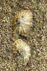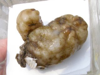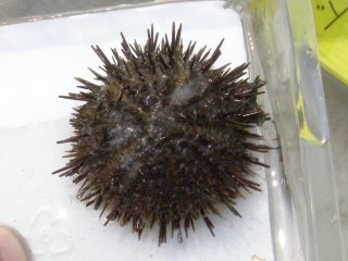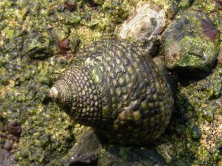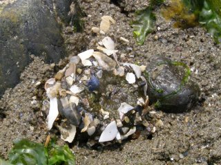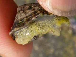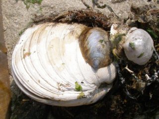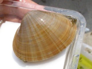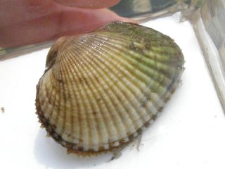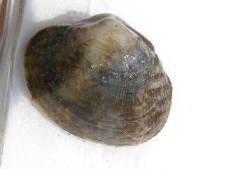 【中】ウチムラサキにシマメノウフネガイ(外来)が着生している。