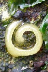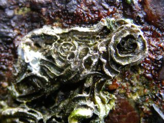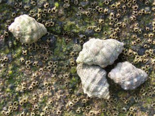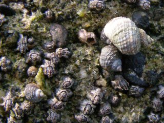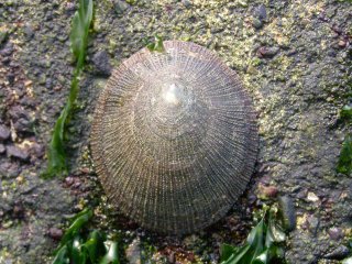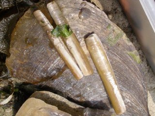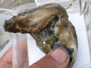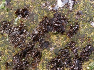 【中】ホトトギスガイ。汚れに強く、内湾の岸壁にイガイと同じで足糸で張り付いている。