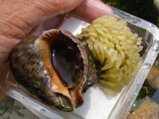 【中】左、カラマツガイ。右、カラマツガイの卵塊。