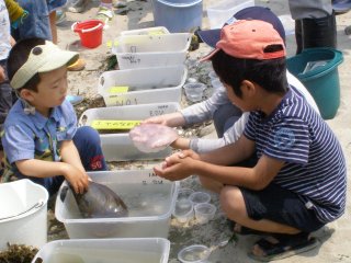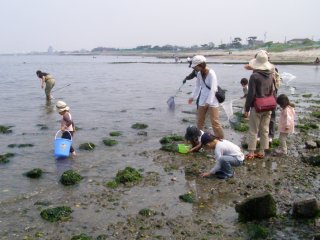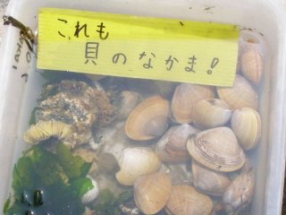 ◎エビジャコ、ニホンモバヨコエビ、オオワレカラ、ヨロイイソギンチャク、タテジマイソギンチャク、ボラ(幼魚)、メジナ(幼魚)、イダテンギンポ、チチブ、コウライヨロイメバル、アゴハゼ、コウライヨロイメバル、タイラギ、アカニシ、アカニシの卵のう(ナギナタホウズキ)、バフンウニ、シマメノウフネガイ、バカガイ、サルボウ、ハイガイ(貝塚から出たもの?)、ツメタガイ、アマクサアメフラシ、〔卵=ラーメンのよう〕 マテガイ、マガキ、ウチムラサキ(オオアサリ)、アサリ、ワカメ、アナアオサ、アマモ、シロボヤ、
