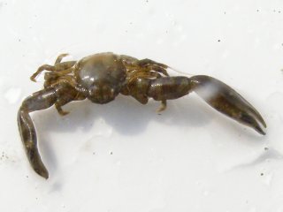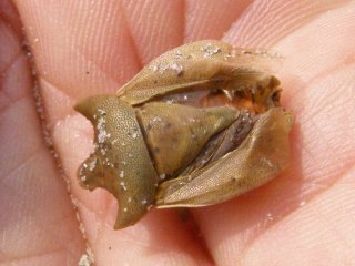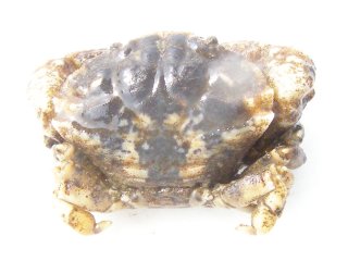 【左】マメコブシガニ、砂地に住み、縦歩きをする