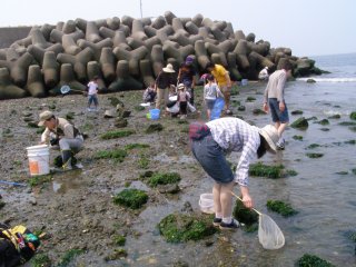 今年度は研修を兼ねての観察会。指導員らの多くの方の参加があった。9時半、集合場所の鬼崎蒲池港Pより、観察場所の港北側に移動。挨拶、注意事項の後、約一時間海に入り、観察をした。魚、貝、海藻 など、次々に観察ケースの中に。風も無く波も穏やかで・・・。10時45分に砂浜で皆の集めた生き物を森田、中井(康)指導員より説明を受けた。参加者の中には物知りの子供もいた。